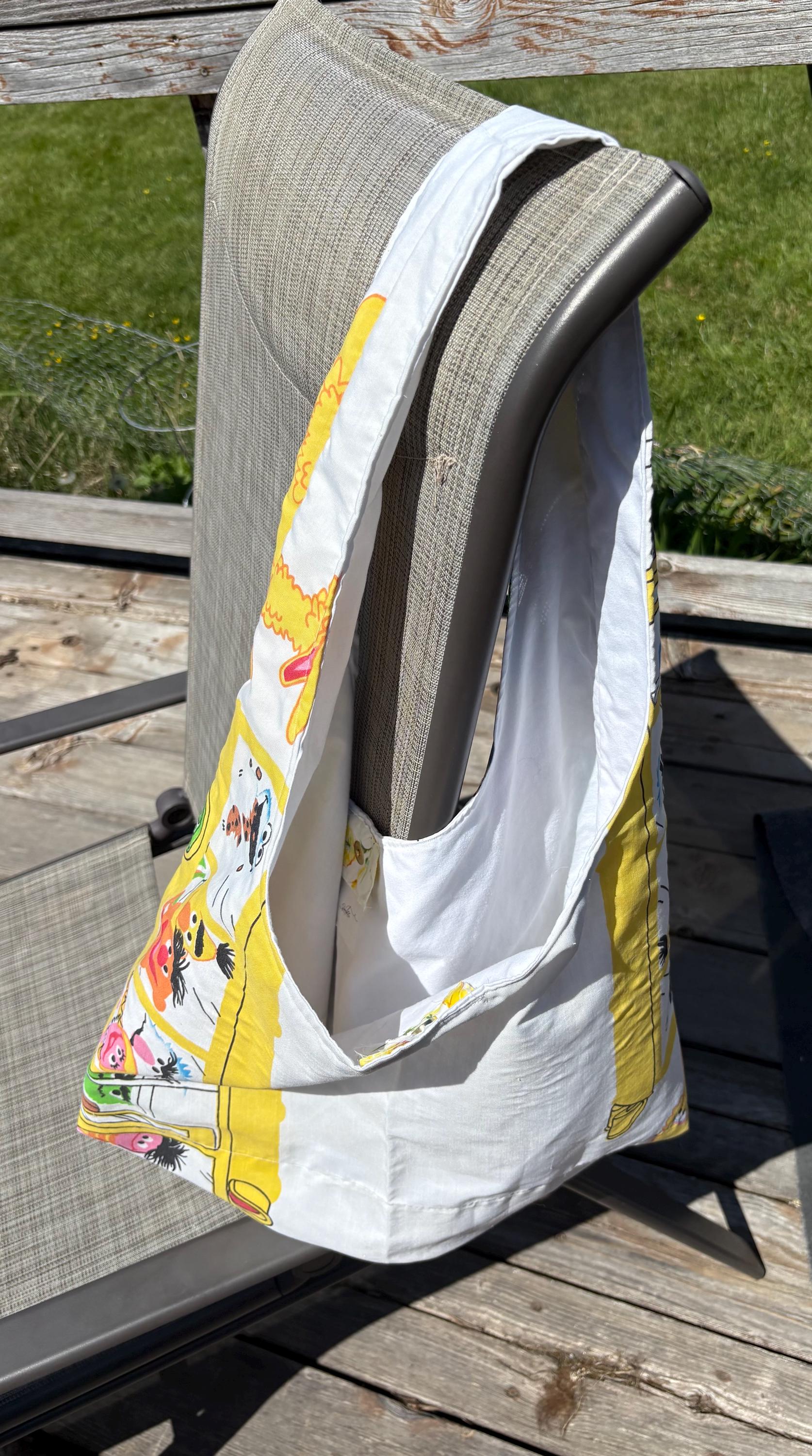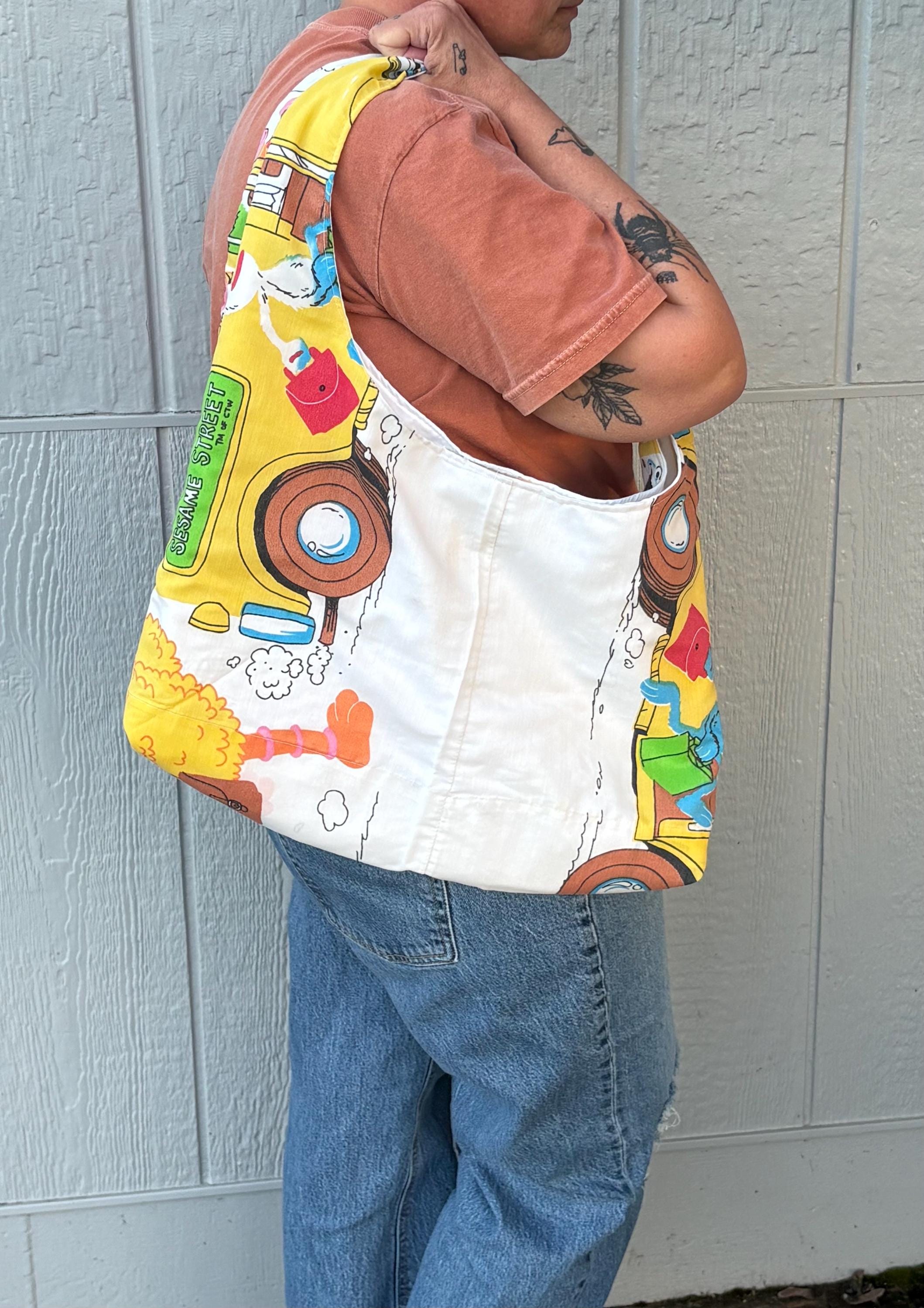 The perfect large hobo bag complete with a sustainable, vintage twist. Truly one of a kind! This tote is handmade by me using vintage Sesame Street fabric from the 70s and 80s. The bag is fully lined with a snap closure. Featuring plenty of room for everyday essentials and a few extras. Truly one of a kind!