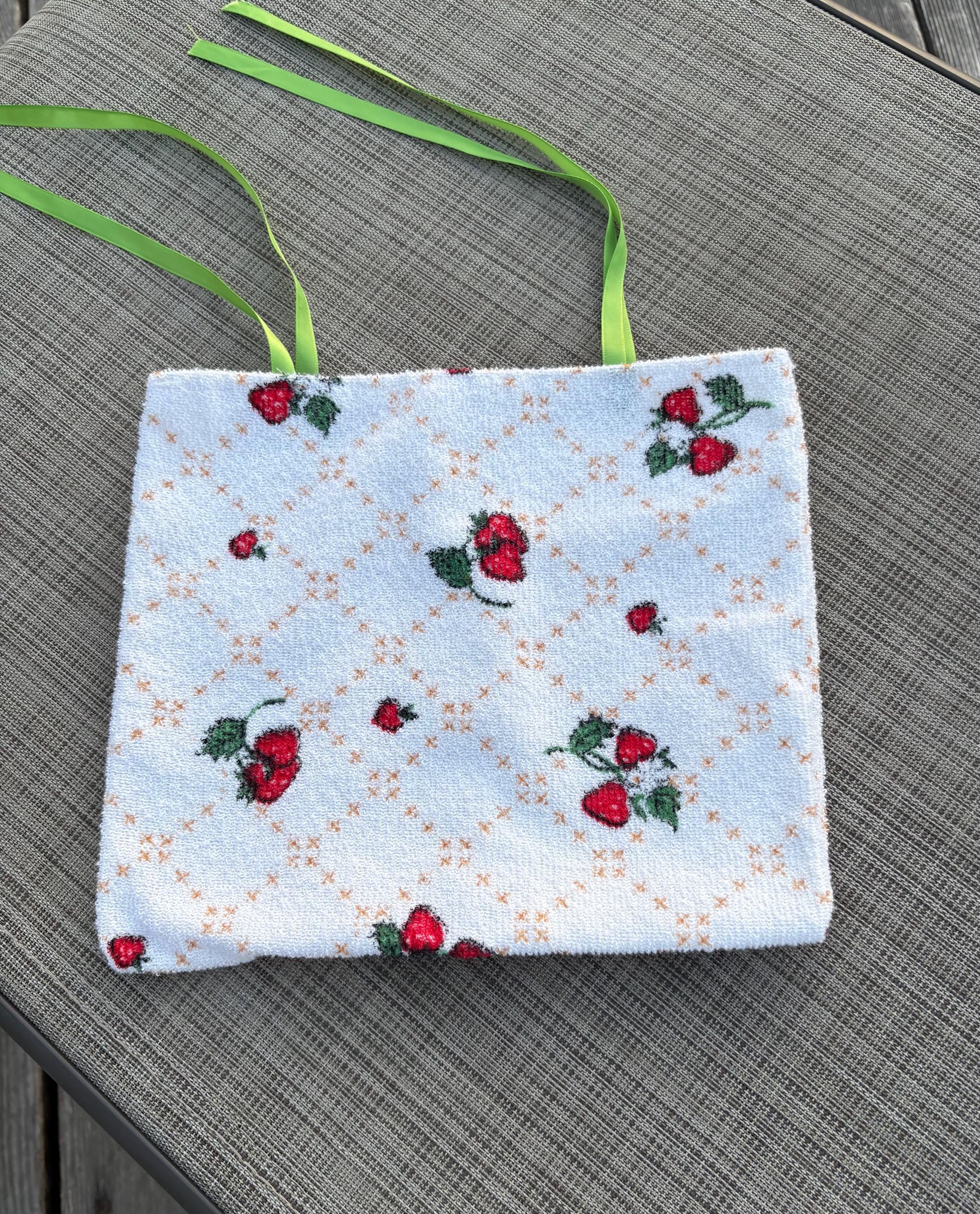 The cutest pouch for your essentials with a fun, vintage twist. The cutest vintage strawberry terry cloth featuring two green ribbon ties. Fully lined.